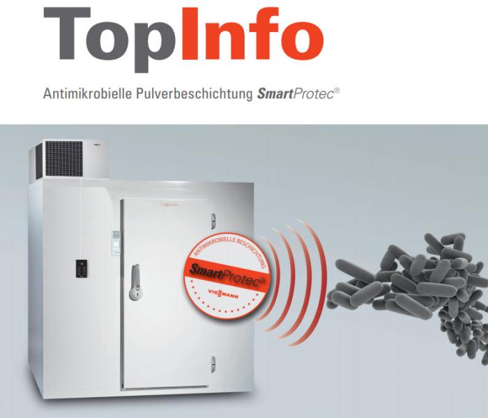 Viessmann erweitert das Hygienepaket seiner Kühlzellen durch eine Pulverbeschichtung für alle Innen- und Außenoberflächen von Wand-, Boden- und Deckenelementen. Die antimikrobielle Beschichtung SmartProtec® ist standardmäßig bei allen Viessmann Tecto Standard Plus Kühlzellen erhältlich.